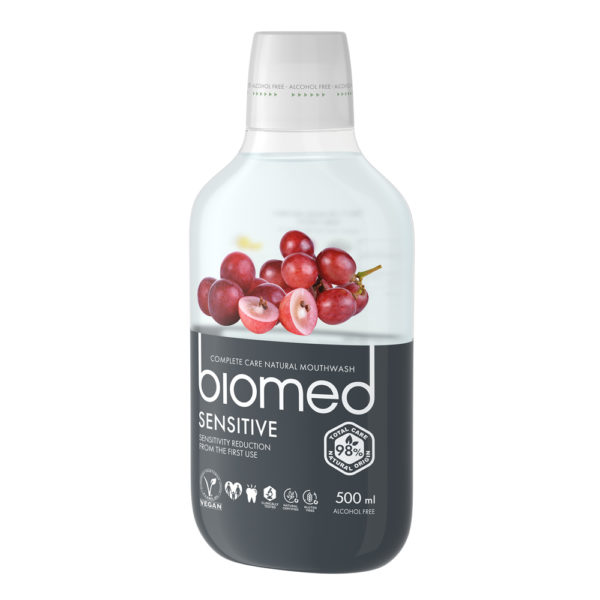 Z 98 % přírodní protizánětlivá ústní voda pro citlivé zuby s BIO certifikací a s výtažky z psyllia, břízy, jadérek hroznového vína a s dubovou kůrou. Chrání před kazem, posiluje dásně. Osvěžující hroznová příchuť. 500 ml.